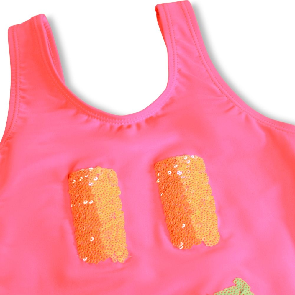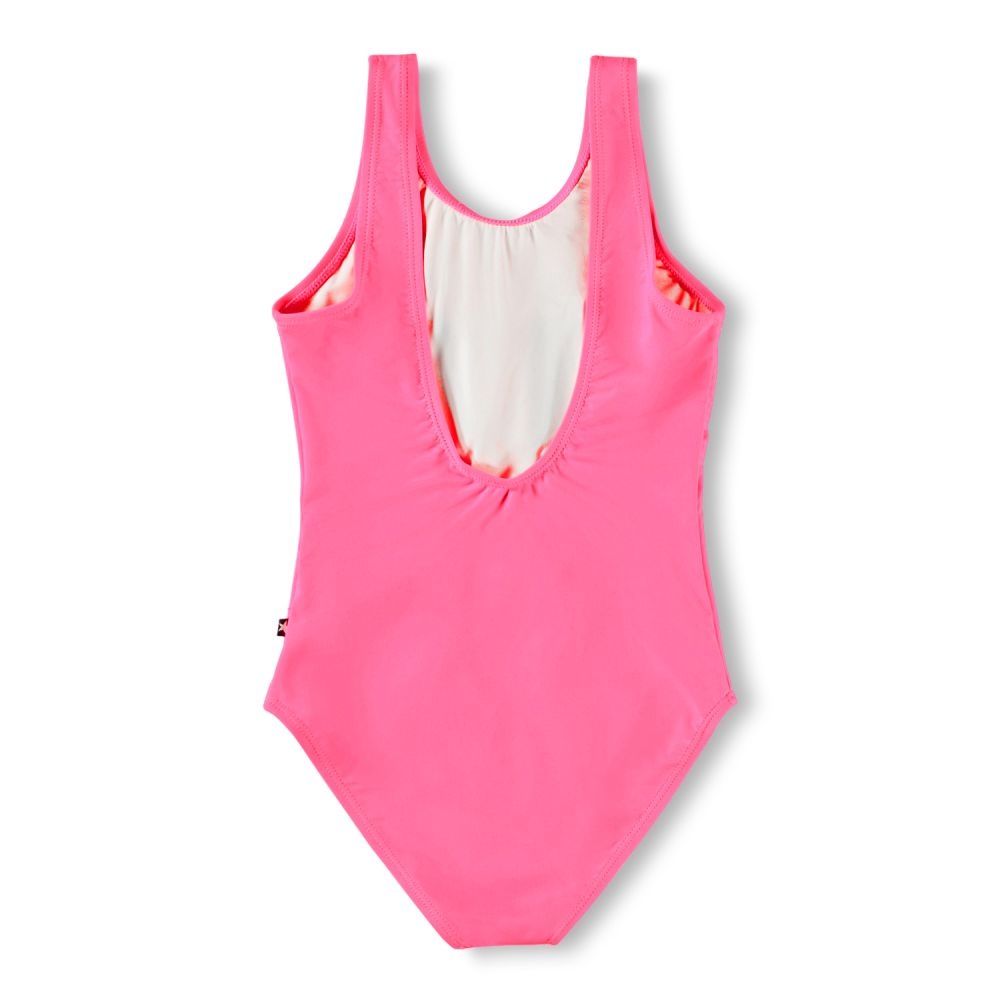 Dit badpak van Molo zorgt meteen voor een glimlach dankzij de vrolijke smiley van pailletten op de voorkant. De heldere roze kleur geeft het badpak een speelse en zomerse uitstraling, terwijl de mouwloze vorm met ronde hals zorgt voor een fijne pasvorm en veel bewegingsvrijheid. De zachte stretchstof voelt comfortabel aan en is perfect voor zwemmen, spelen en waterpret. Een opvallend en leuk badpak dat helemaal past bij de creatieve en kleurrijke stijl van Molo.