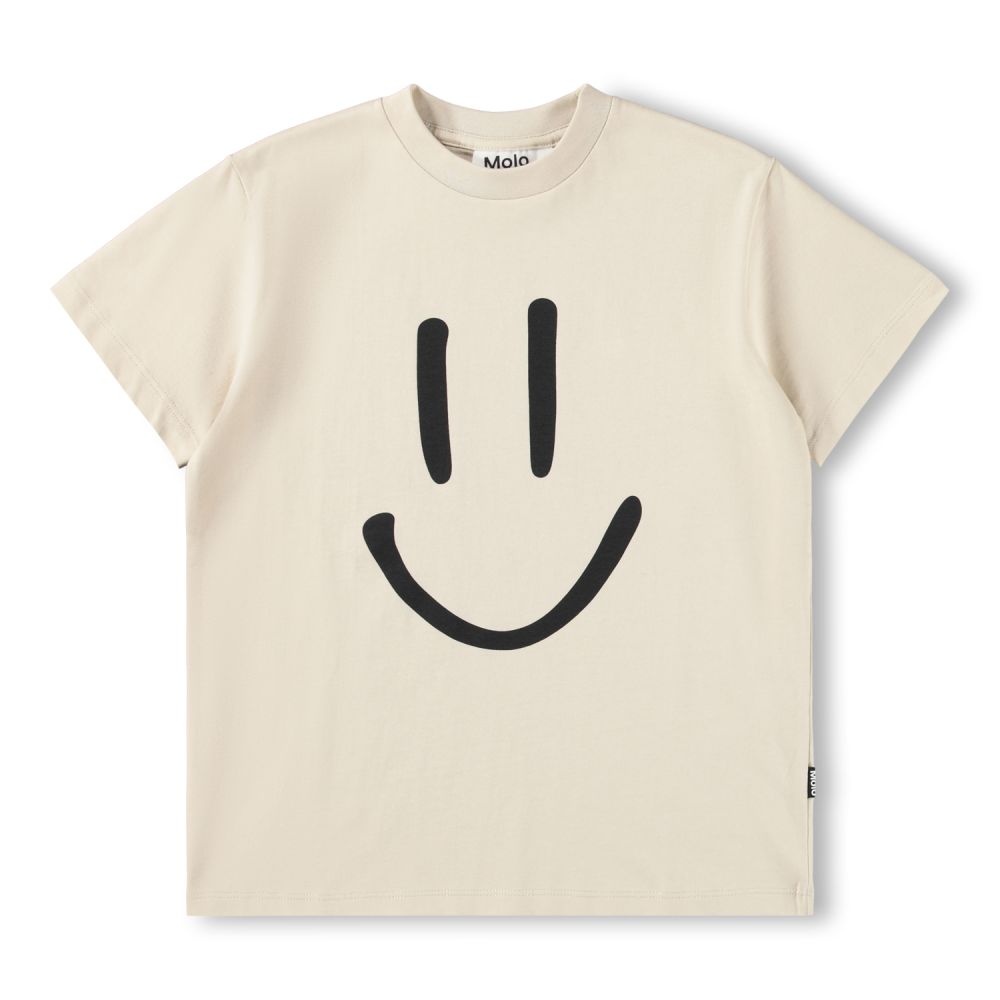 Dit Molo shirt is een vrolijke top met korte mouwen in een zachte crèmekleur. Op de voorkant staat een grote zwarte smileyprint, herkenbaar en speels tegelijk. Het t-shirt heeft een rechte, comfortabele pasvorm en is gemaakt van zacht katoen, waardoor het prettig draagt tijdens spelen en bewegen. Deze Molo top met korte mouwen is makkelijk te combineren met een short, jeans of rok en past moeiteloos in een zomerse outfit.