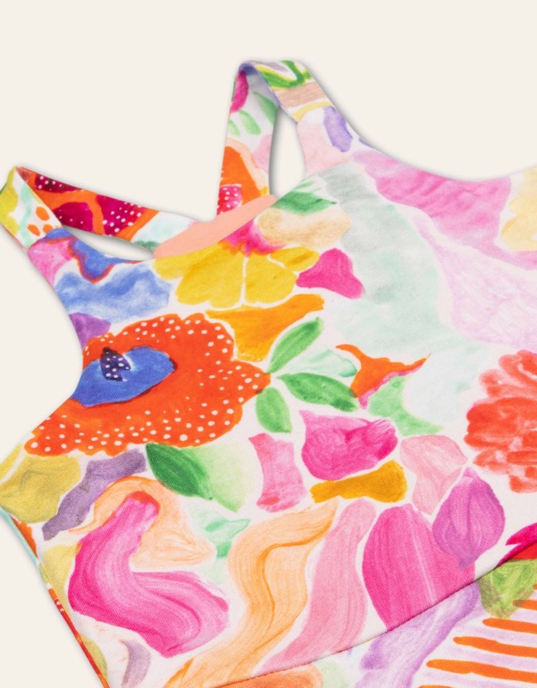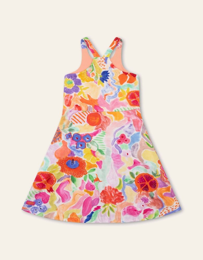 Deze jurk heeft een speelse en kleurrijke print, echt kenmerkend Oilily. Het zomer jurkje heeft een comfortabele pasvorm en een licht uitlopende rok. De brede bandjes en de aangesloten bovenkant zorgen voor een fijne fit, terwijl de stof soepel meebeweegt bij elke stap. Dankzij de mix van biologisch katoen en elastaan voelt de jurk zacht aan op de huid en biedt hij voldoende stretch voor dagelijks draagcomfort. Een vrolijk item dat makkelijk te combineren is en geschikt is voor allerlei momenten.