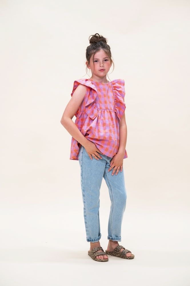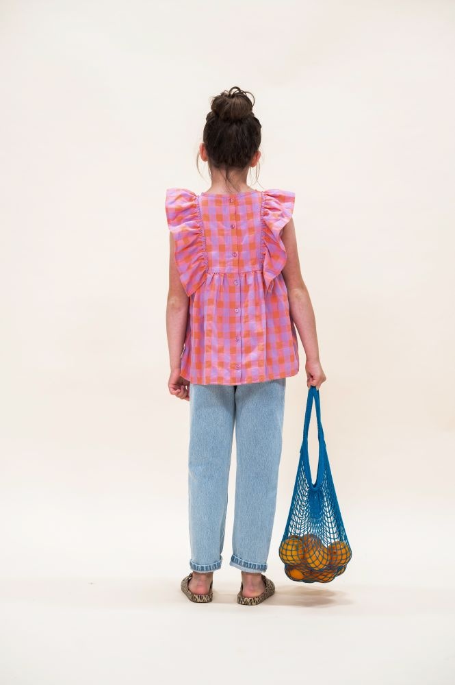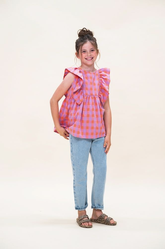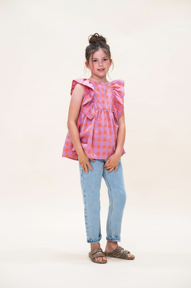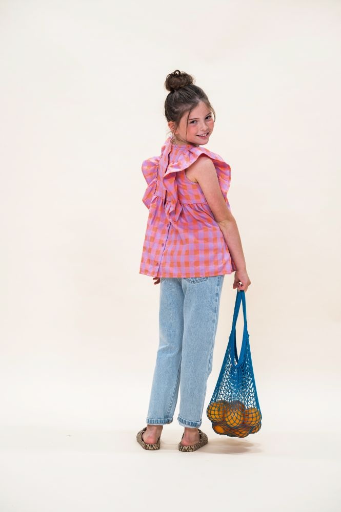 De Ruffle Blouse van Petit Blush is gemaakt van 100% biologisch katoen. Het vrolijke ruitjespatroon in de kleuren gamba (oranje) en hortensia (roze/paars) geeft een speelse uitstraling, terwijl de ruches langs de schouders het ontwerp een verfijnde touch geven. Deze luchtige top is perfect voor warme dagen en combineert moeiteloos met een broekje of rok voor een casual, maar stijlvolle outfit.