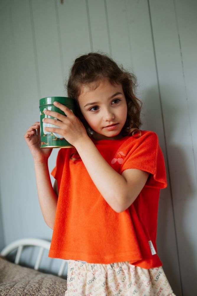 Deze rode top van Petit Blush heeft een zachte, comfortabele uitstraling en is fijn voor dagelijks dragen. De mouwloze top is gemaakt van een zachte badstof en voelt prettig aan op de huid. Op de borst staat een klein geborduurd kersendetail in een lichte tint, wat zorgt voor een speels accent. De warme rode kleur maakt deze kinder top makkelijk te combineren met een broek, short of rok. Een relaxed item met de herkenbare stijl van Petit Blush.