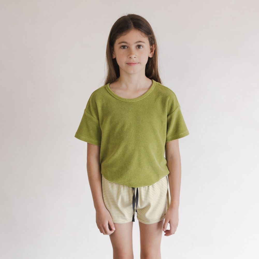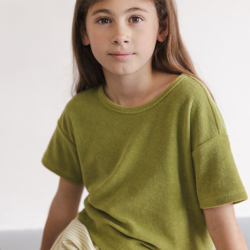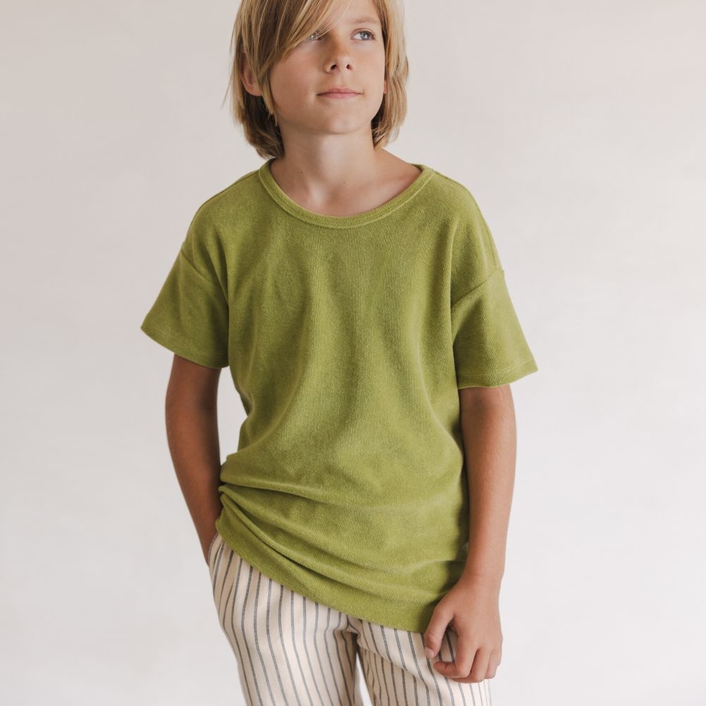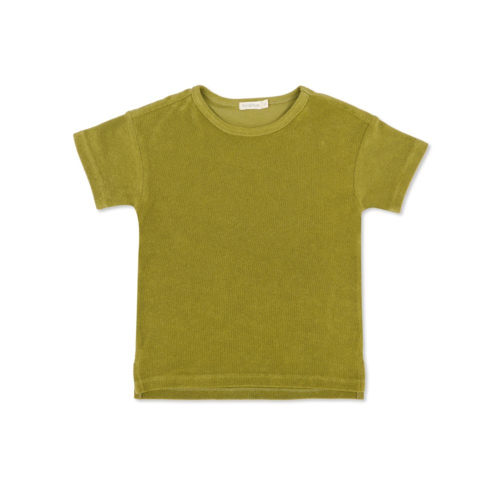 Een nieuw item in het bekende badstof materiaal van Phil en Phae: het Matcha kleurige t-shirt. Dit groene shirt is lekker zacht en heeft een losse fit.