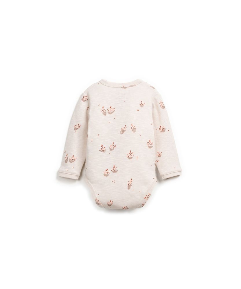 Dit zachte rompertje met lange mouwen van Play Up is gemaakt van biologisch katoen en voelt heerlijk comfortabel aan op de huid van je baby. Het overslag model sluit gemakkelijk met drukknoopjes, waardoor aankleden en verschonen extra eenvoudig gaat. De lichte crème kleur met subtiele print geeft dit babypakje een tijdloze uitstraling. Perfect als basislaagje, maar ook mooi om zo te dragen.