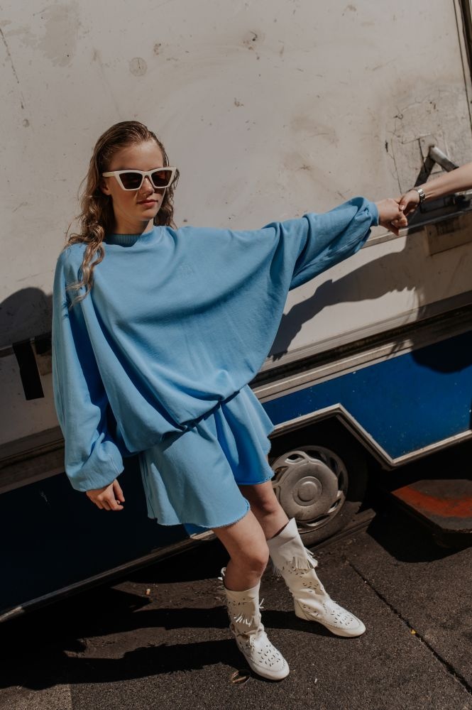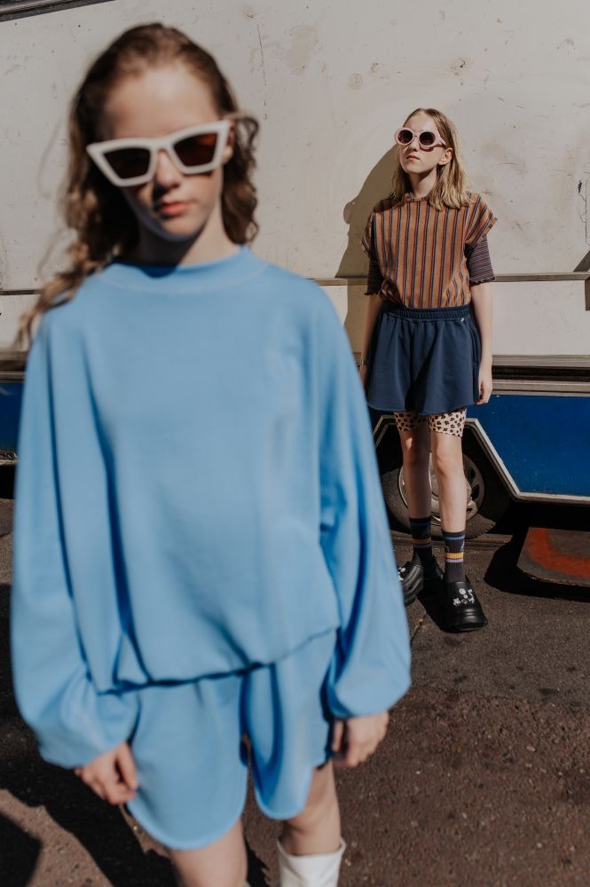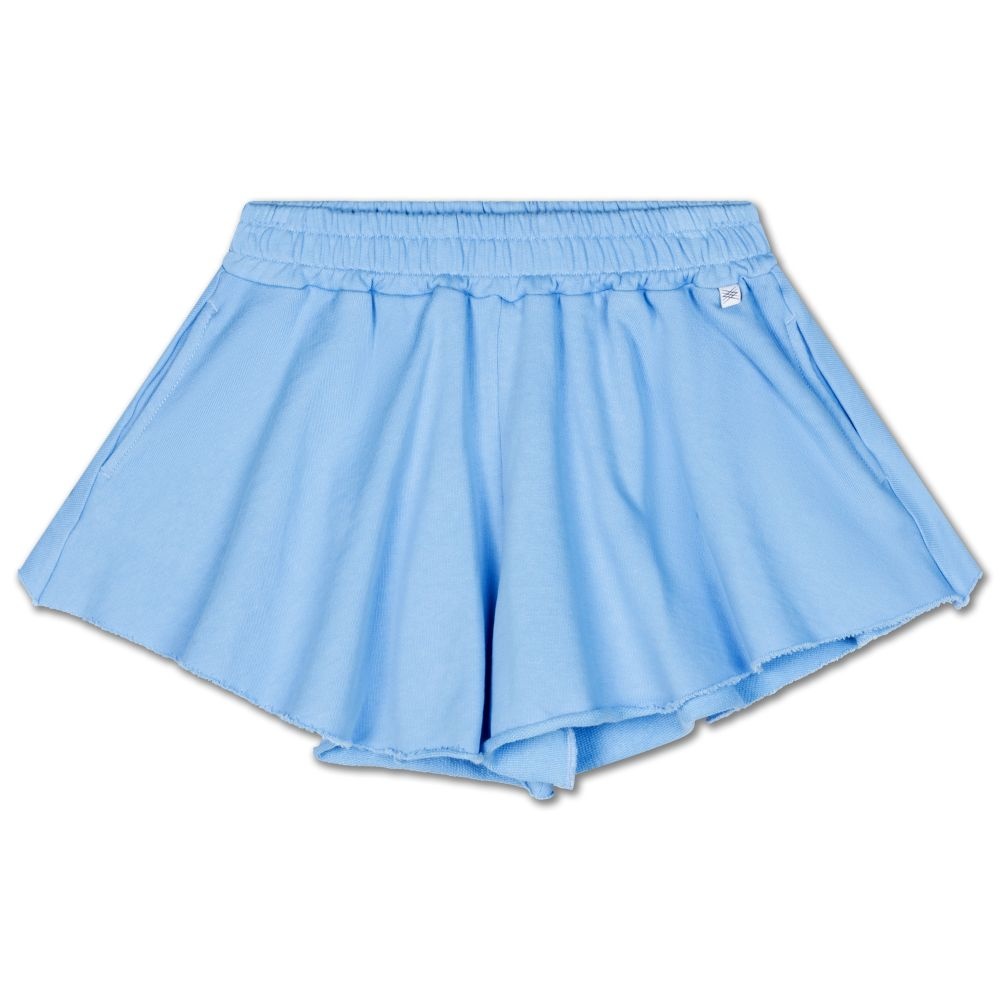 Lichtblauwe korte broek van Repose AMS met een butterfly effect. De geplooide short heeft een wijd uitlopende, onafgewerkte zoom wat zorgt voor een speels effect en maximale bewegingsvrijheid. In de twee steekzakken kunnen kleine schatten worden bewaard. De short is goed te combineren met een oversized sweater en in de winter ook te dragen met een maillot.