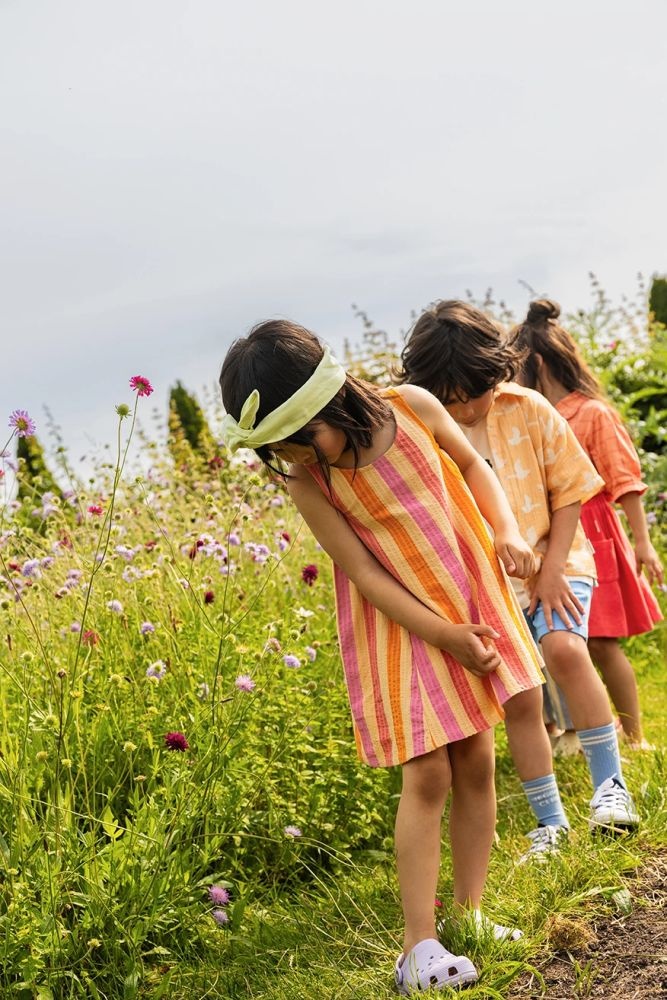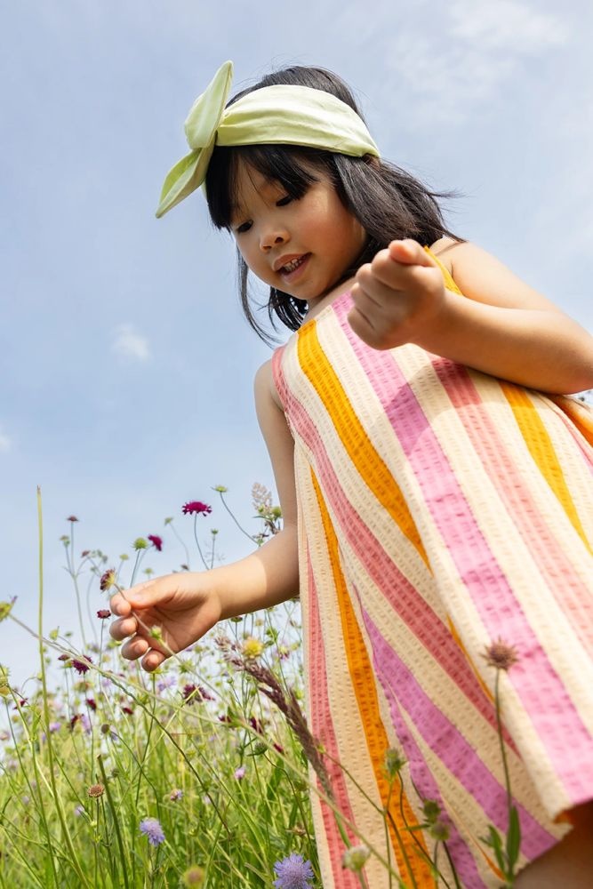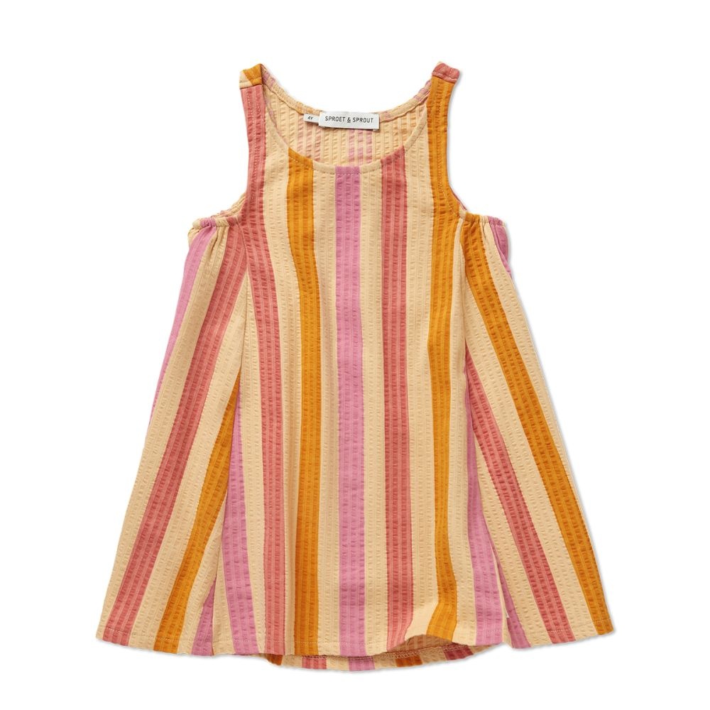 Mouwloze zomerjurk van het merk Sproet en Sprout. Een perfecte zomerse outfit met het vrolijke strepenpatroon in de kleuren geel, oranje en roze. Het jurkje is gemaakt van een zachte mousseline stof, je kindje zal er direct dol op zijn.