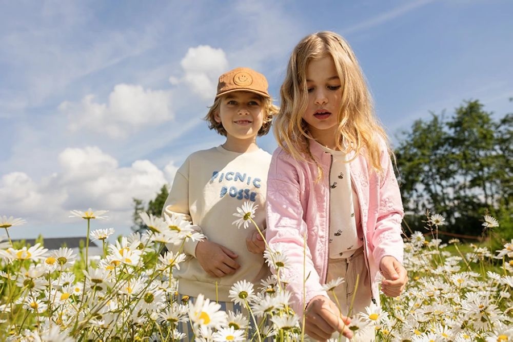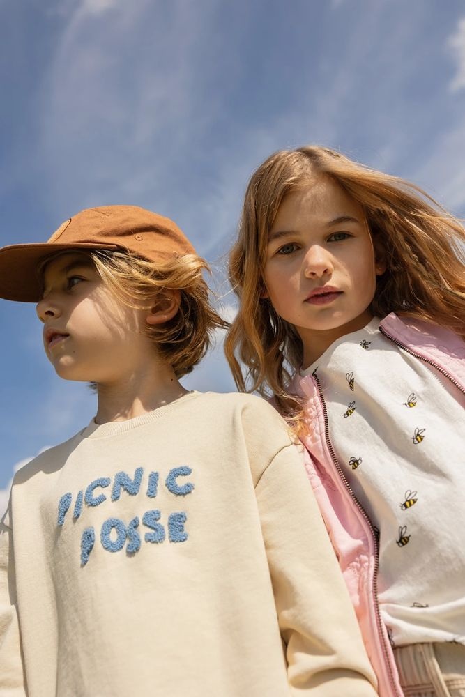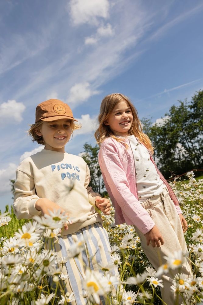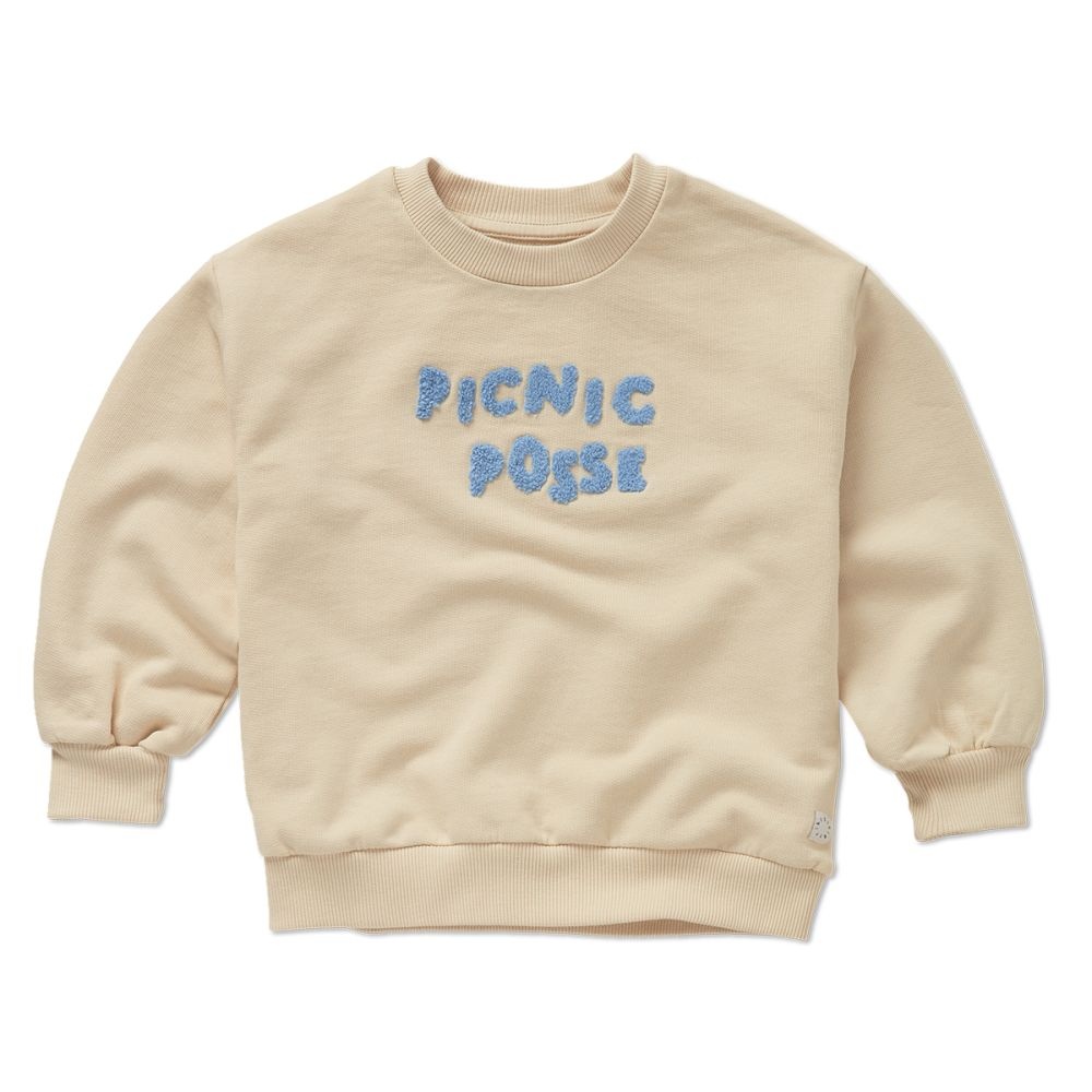Crèmekleurige trui van Sproet en Sprout. Op de voorkant van het sweatshirt staat de tekst 'picnic posse' in licht blauwe teddy stof. De sweater heeft een oversized fit en geribbelde manchetten.
