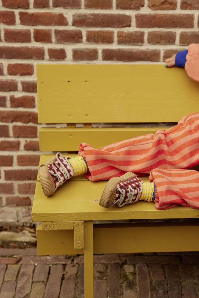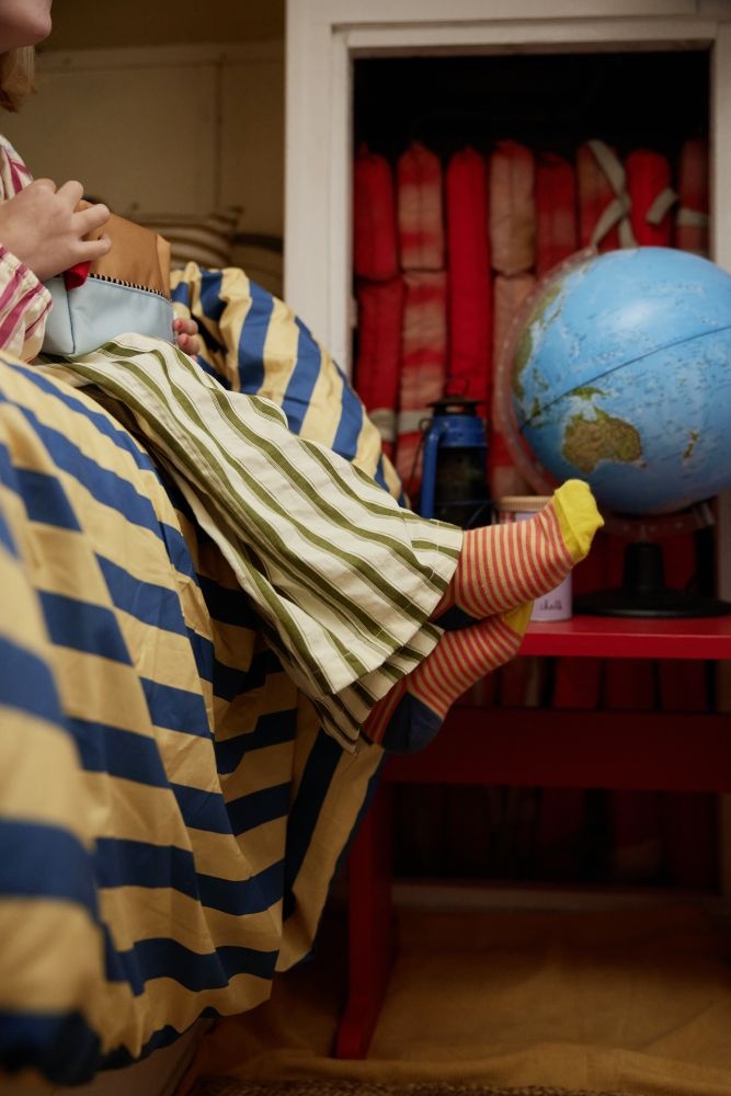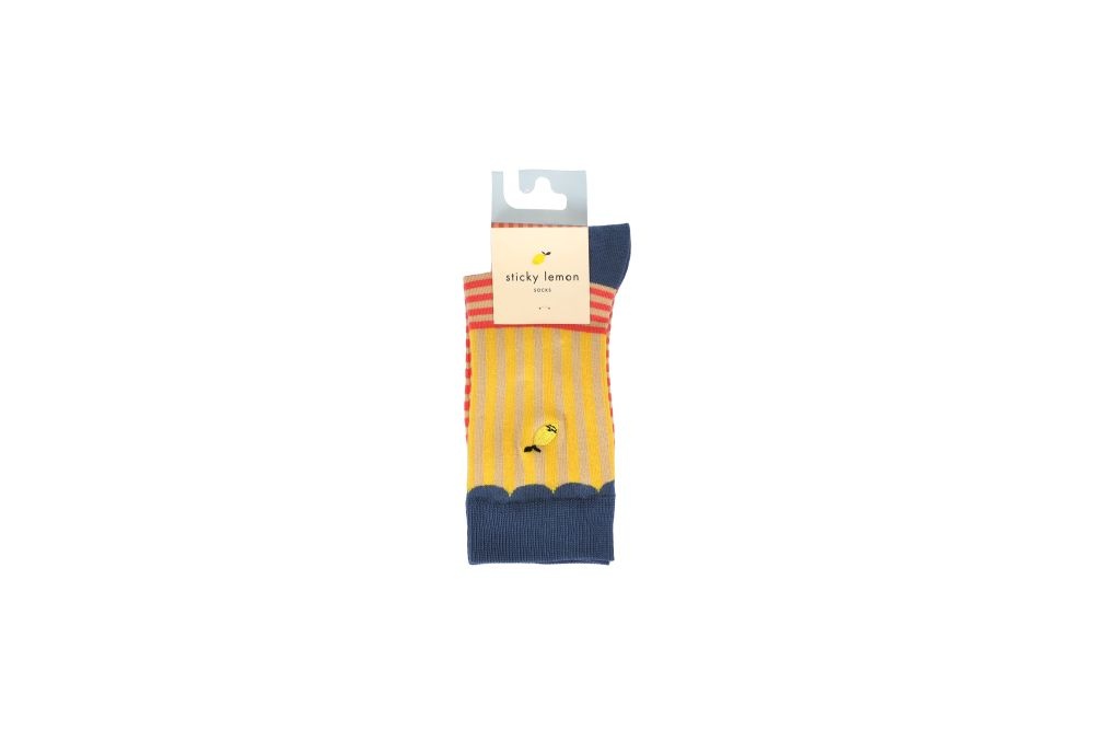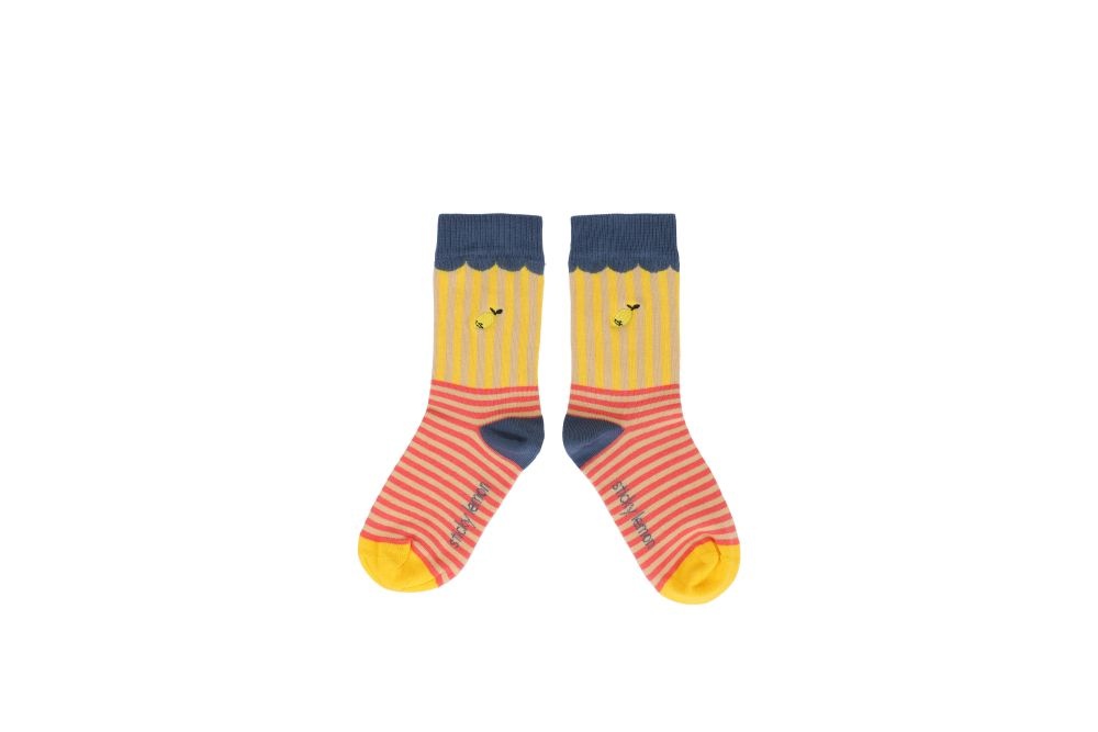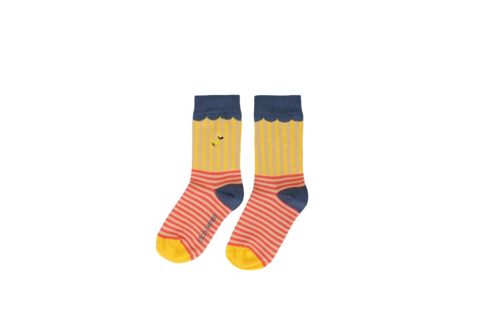 Gestreepte sokken van Sticky Lemon in de kleuren geel, koraal roze en donkerblauw. Comfortabel en vrolijk. Met deze gezellige sokken, geef je iedere outfit een kleurrijke twist.