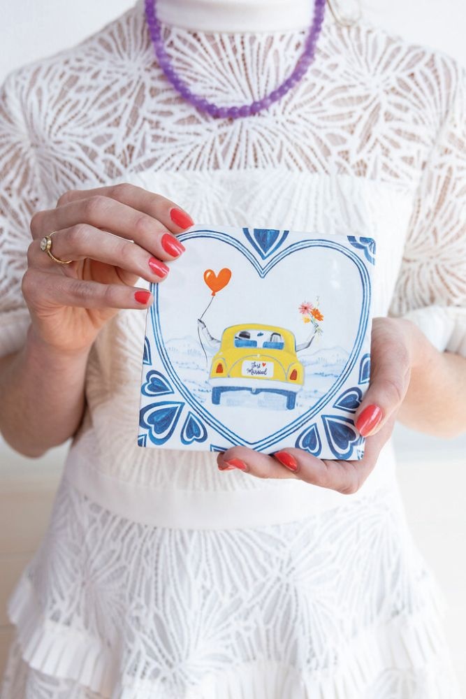 Net getrouwd en klaar voor een nieuw avontuur samen! Dit romantische StoryTile-tegeltje laat een pasgetrouwd stel zien in een vrolijke gele auto, met een ballon en bloemen in de hand. Het tafereel, omlijst met blauwe hartvormige patronen, straalt liefde, geluk en een vleugje nostalgie uit. Een perfect huwelijkscadeau of herinnering aan een onvergetelijke dag.