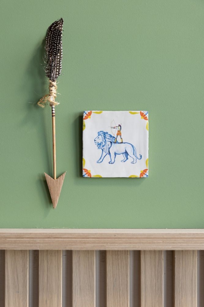 De Storytiles tegel The Warrior In Me – Smallis een krachtig keramisch tegeltje met een symbolische en inspirerende uitstraling. Op deze illustratie staat een boogschutter stevig op de rug van een leeuw. De combinatie van vastberadenheid en rust straalt zelfvertrouwen en innerlijke kracht uit.