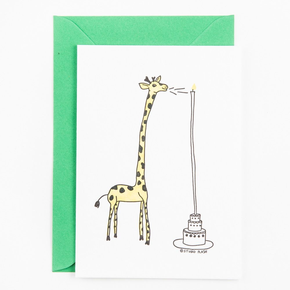 Wie jarig is, mag kaarsjes uitblazen! Net als de giraffe op deze verjaardagskaart. Naar wie stuur jij een felicitatie met deze vrolijke kaart?