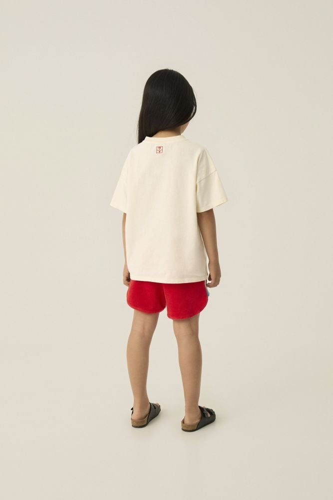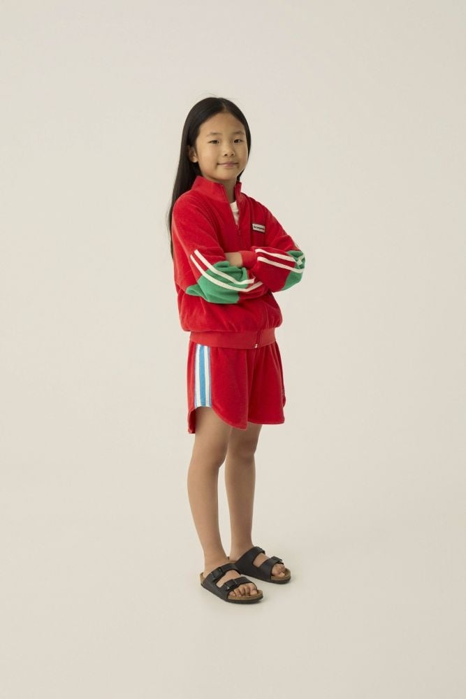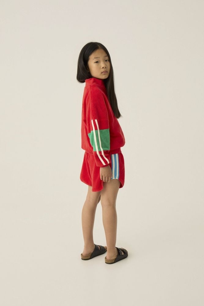 Deze sportieve korte broek van The Campamento heeft een speelse, retro uitstraling en is perfect voor actieve dagen. De short is uitgevoerd in warm rood met contrasterende zijstrepen in blauw en wit en een groene elastische tailleband. Dankzij de zachte badstof voelt deze korte broek comfortabel aan op de huid. De elastische taille met aantrekkoord zorgt voor een fijne pasvorm en extra draaggemak. Ideaal om te combineren met een t-shirt, sweater of top met korte mouwen voor een relaxte outfit.