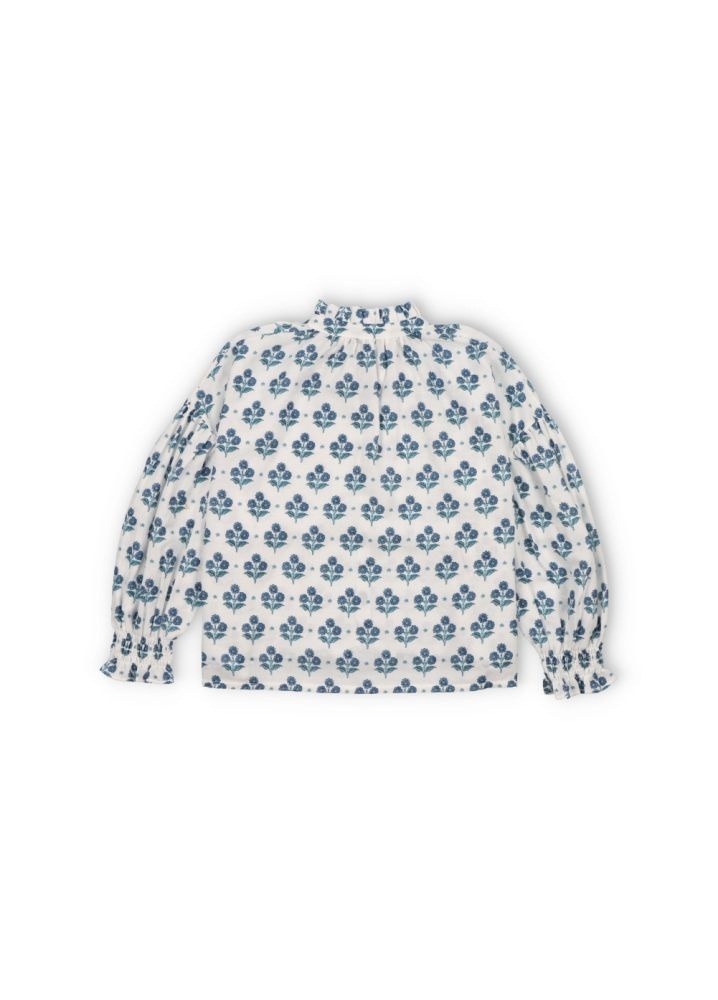 Blouse met de bekende hyacint print van The New Society. De top met lange mouwen heeft een hoge hals met naar wens verstelbare strik. De gesmokte mouwen geven een sierlijk effect.