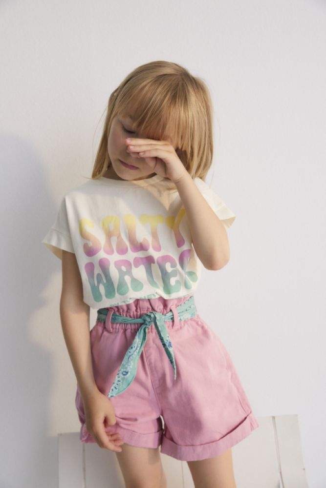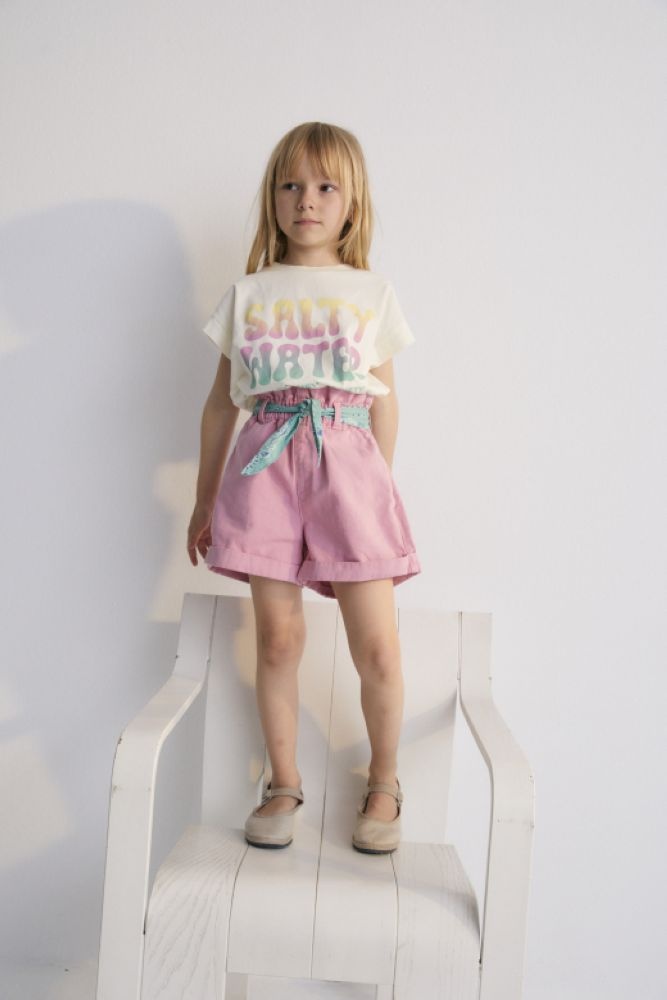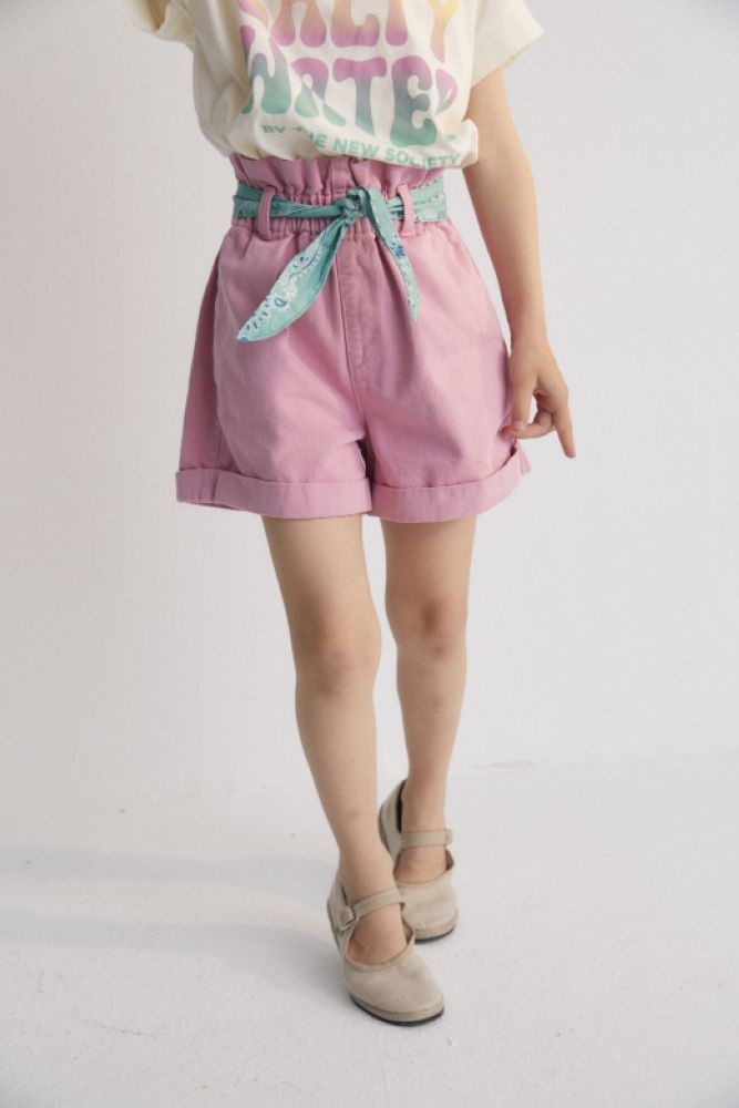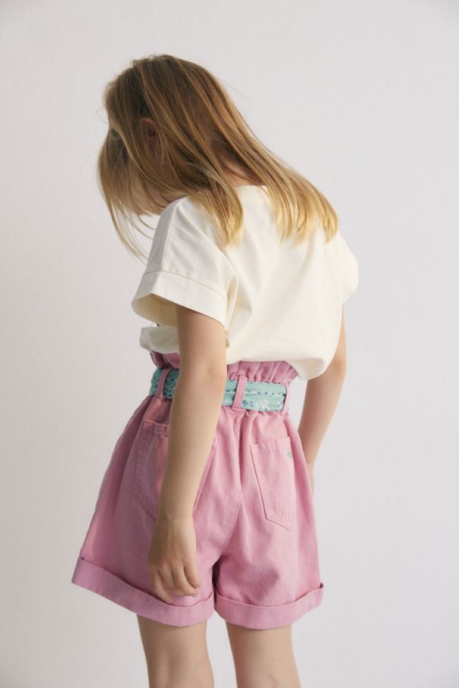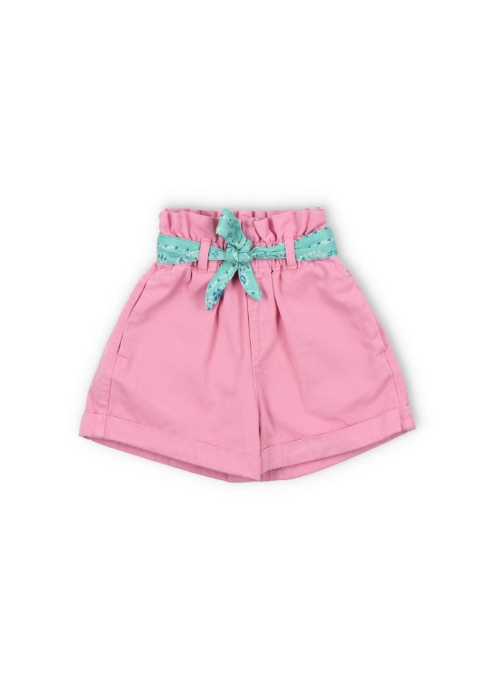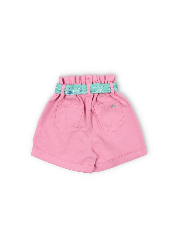 Korte roze broek met een gewassen effect en opgerolde pijpen. De wijde bermuda heeft een lichtblauwe bandana als riem en een gesmokte elastische tailleband. De short is gemaakt van 100% katoen.