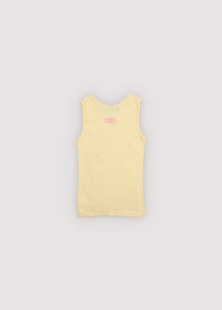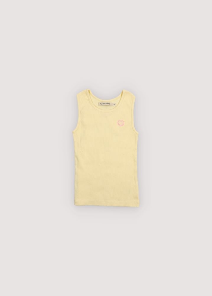Deze mouwloze top van The New Society is uitgevoerd in een zachte, lichtgele kleur en gemaakt van een fijne ribstof. De top heeft een aangesloten pasvorm en voelt comfortabel aan op de huid, ideaal om los te dragen of als laagje onder een blouse of vest. Het subtiele smiley-detail op de borst geeft het hemd een speelse uitstraling. Een fijne basic die makkelijk te combineren is met een short, rok of lange broek uit de collectie van The New Society.