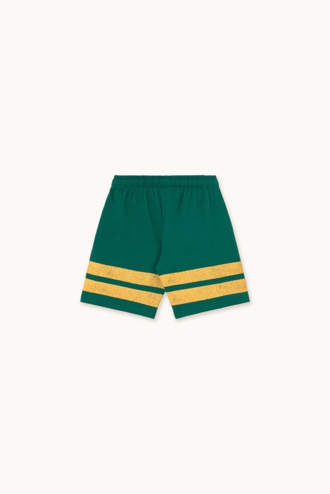 Deze sportieve short van Tiny Cottons is een heerlijk item voor de warme zomerdagen. De donkergroene kleur in combinatie met de oranje strepen geven de korte broek een stoere look. Door het verstelbare trekkoord in de taille kan het broekje gemakkelijk naar wens worden aangesnoerd.