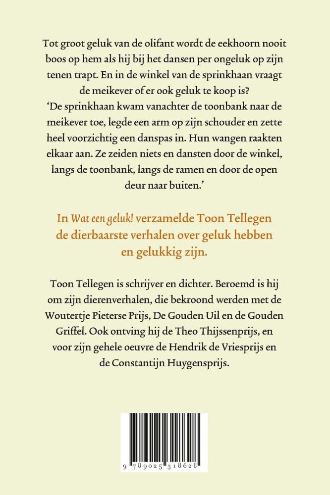 De olifant voelt zich heel gelukkig worden omdat de eekhoorn niet boos wordt als hij hem bij het dansen steeds per ongeluk op de tenen trapt. De schildpad twijfelt en denkt het ene moment dat hij heel gelukkig is en het andere moment diep ongelukkig. Ondertussen vraagt de meikever in de winkel van de sprinkhaan verlegen of hij ook geluk verkoopt? ‘De sprinkhaan kwam vanachter de toonbank naar de meikever toe, legde een arm op zijn schouder en zette heel voorzichtig een danspas in. Hun wangen raakten elkaar aan. Ze zeiden niets en dansten door de winkel, langs de toonbank, langs de ramen en door de open deur naar buiten.’ Wat een geluk!